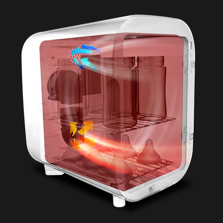 Simply hit a button, and watch your baby and household essentials get sanitized and dried in just 30 minutes.