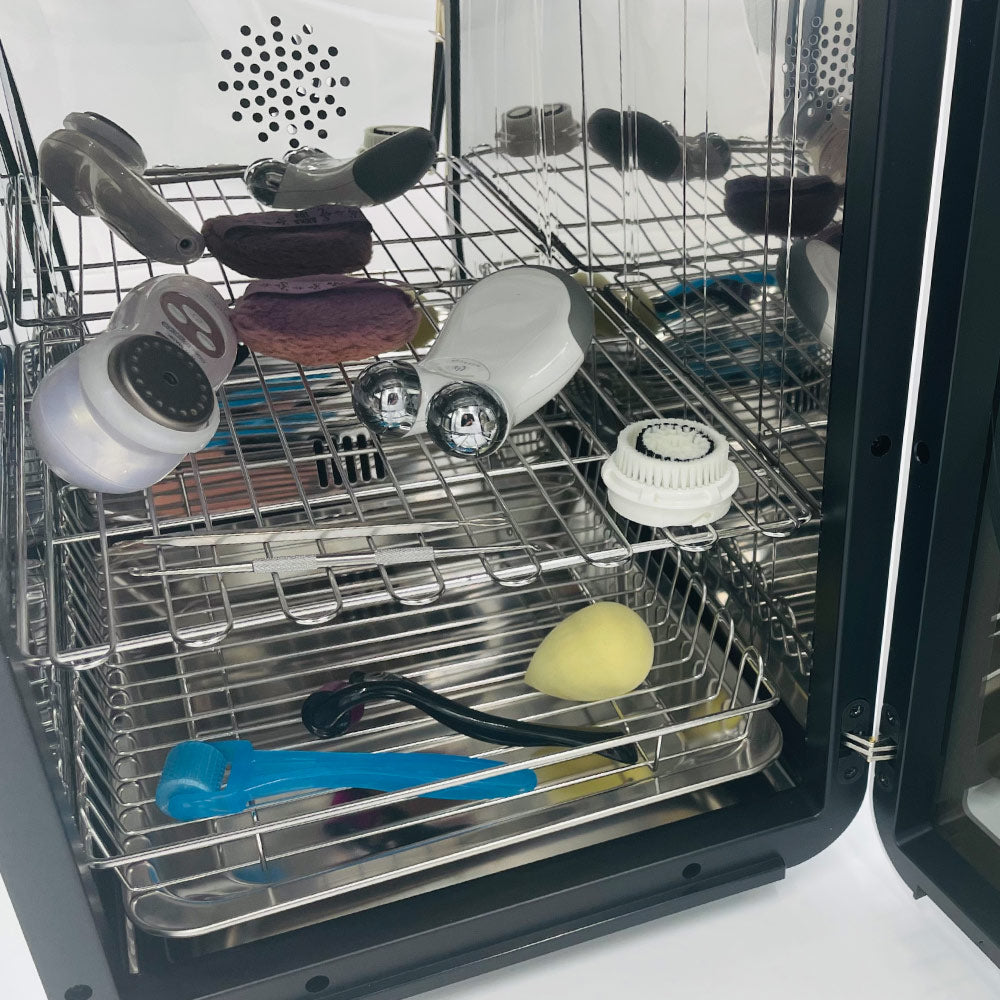 - 3-in-1: Sanitizer + dryer + Storage unit.